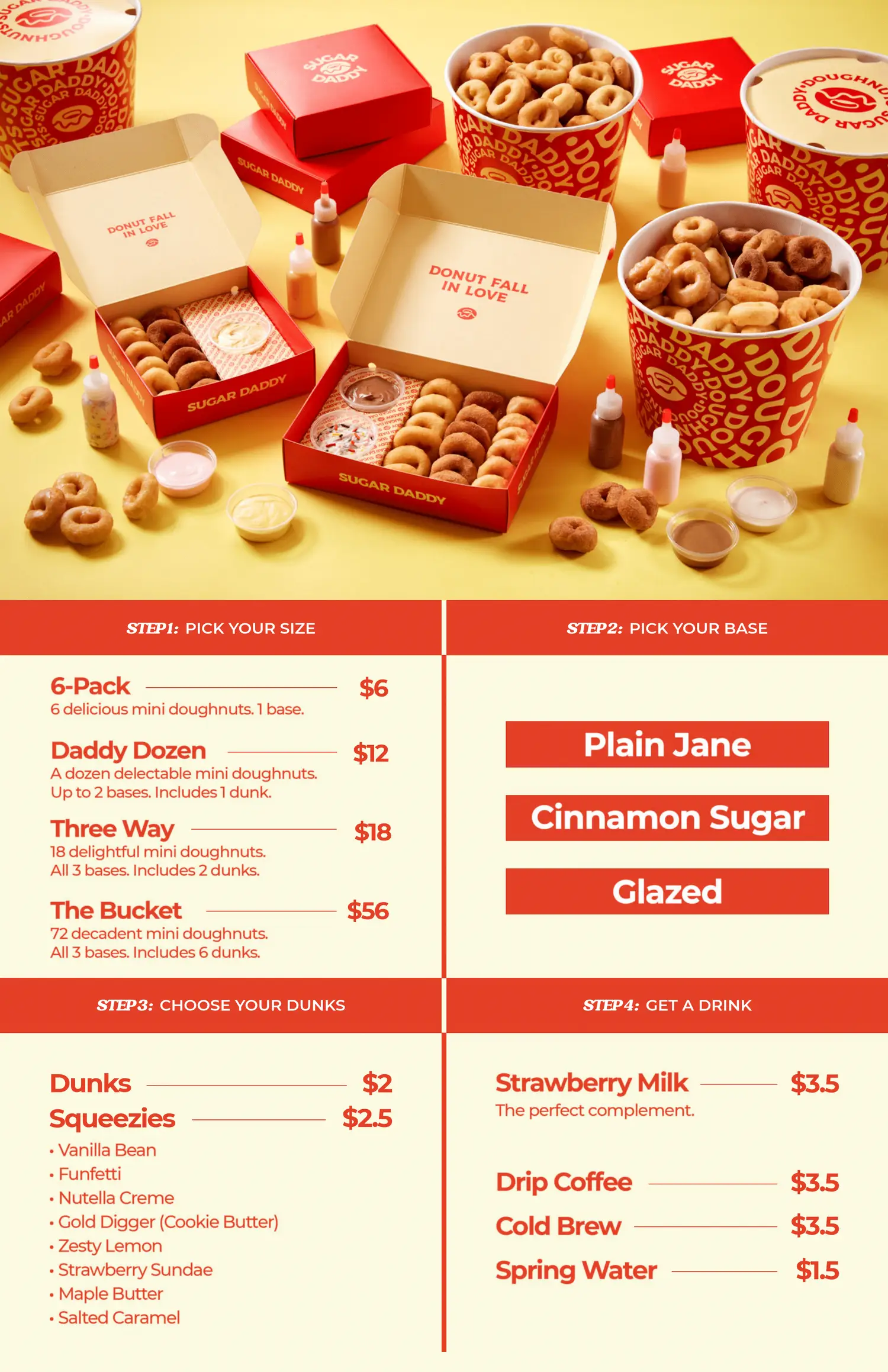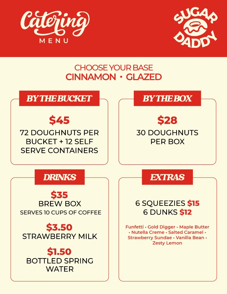 Order doughnuts 'By The Bucket' or 'By the Box' along with your choice of Dunks or Squeezies. We'll make them at our closest location within an hour of your requested time, and deliver them to you for you and your guests to enjoy!